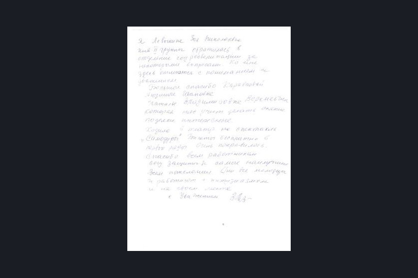 "Здравствуйте сотрудники самой отзывчивой организации социальной службы "Добрыня" Новосибирского района. В трудную, мою, жизненную ситуацию Вы первые пришли мне на помощь. Прозоровой Ирине Васильевна, инвалиду 3ей группы (Трепонация черепа и инсульт, группа рабочая, но мой болезненный вид и моё состояние не даёт желания работодателям брать меня на работу) Мне очень долго оформляли пенсию и я жила в про голодь, родных и близких рядом ни кого нет. Мне повезло, что Вы приняли на работу соц. работника Меркулову Людмилу Сергеевну, которая и узнала о моих страдания, посетив меня на дому, и увидев мой пустой холодильник она тут же лично подала мне деньги и волонтерской группой "Берегиня", которую она организовала помогли мне продуктами. Ваша материальная помощь мне поможет погасить накопленные долги.